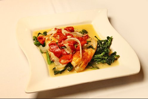 pan seared with fresh tomatoes, black olives, garlic, and olive oil in a red or white sauce